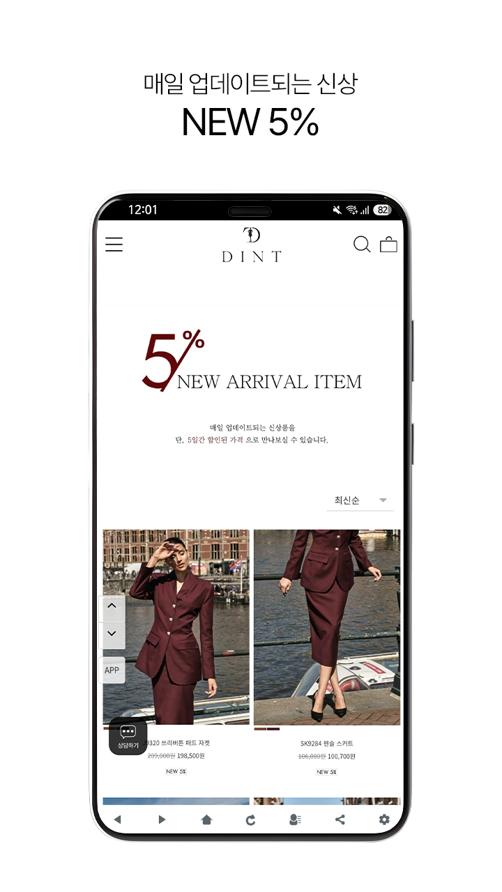 딘트(DINT) 쇼핑몰 앱은 여성 의류 전문 쇼핑몰 딘트의 공식 모바일 애플리케이션입니다. 최신 트렌드를 반영한 다양한 패션 아이템을 모바일 환경에서 편리하게 탐색하고 구매할 수 있도록 설계되었습니다. 딘트 앱은 사용자들이 언제 어디서든 손쉽게 쇼핑을 즐기고, 신상품 소식, 특별 할인 정보, 이벤트 등을 실시간으로 받아볼 수 있도록 최적화된 기능을 제공합니다. 특히, 고품질의 상품 이미지와 상세한 설명, 그리고 사용자 맞춤형 추천 기능을 통해 온라인 쇼핑의 만족도를 높이는 데 중점을 두고 있습니다. 모바일 환경에 특화된 사용자 인터페이스(UI)와 사용자 경험(UX)을 제공하여, 웹사이트 접속 없이도 앱 하나로 딘트의 모든 서비스를 이용할 수 있도록 합니다. 빠르고 안정적인 결제 시스템과 편리한 주문 조회 기능 또한 딘트 앱의 주요 강점 중 하나입니다.